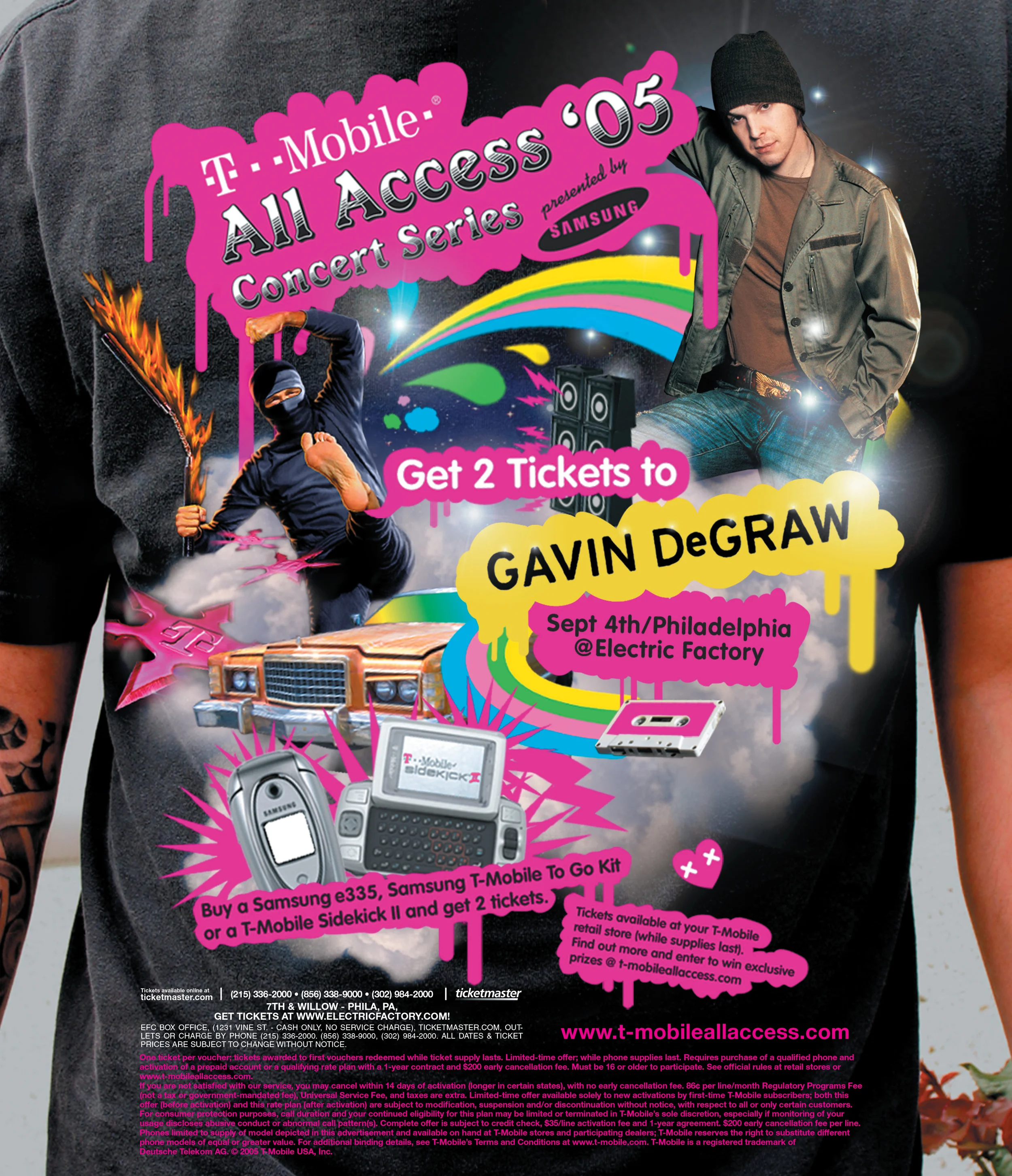 Local print ads promoting the individual shows were designed to look like band t-shirts. We supported the campaign with CD's designed to look like weathered vinyl records to be given away at T-Mobile stores, and tour shirts for T-Mobile employees and event staff.